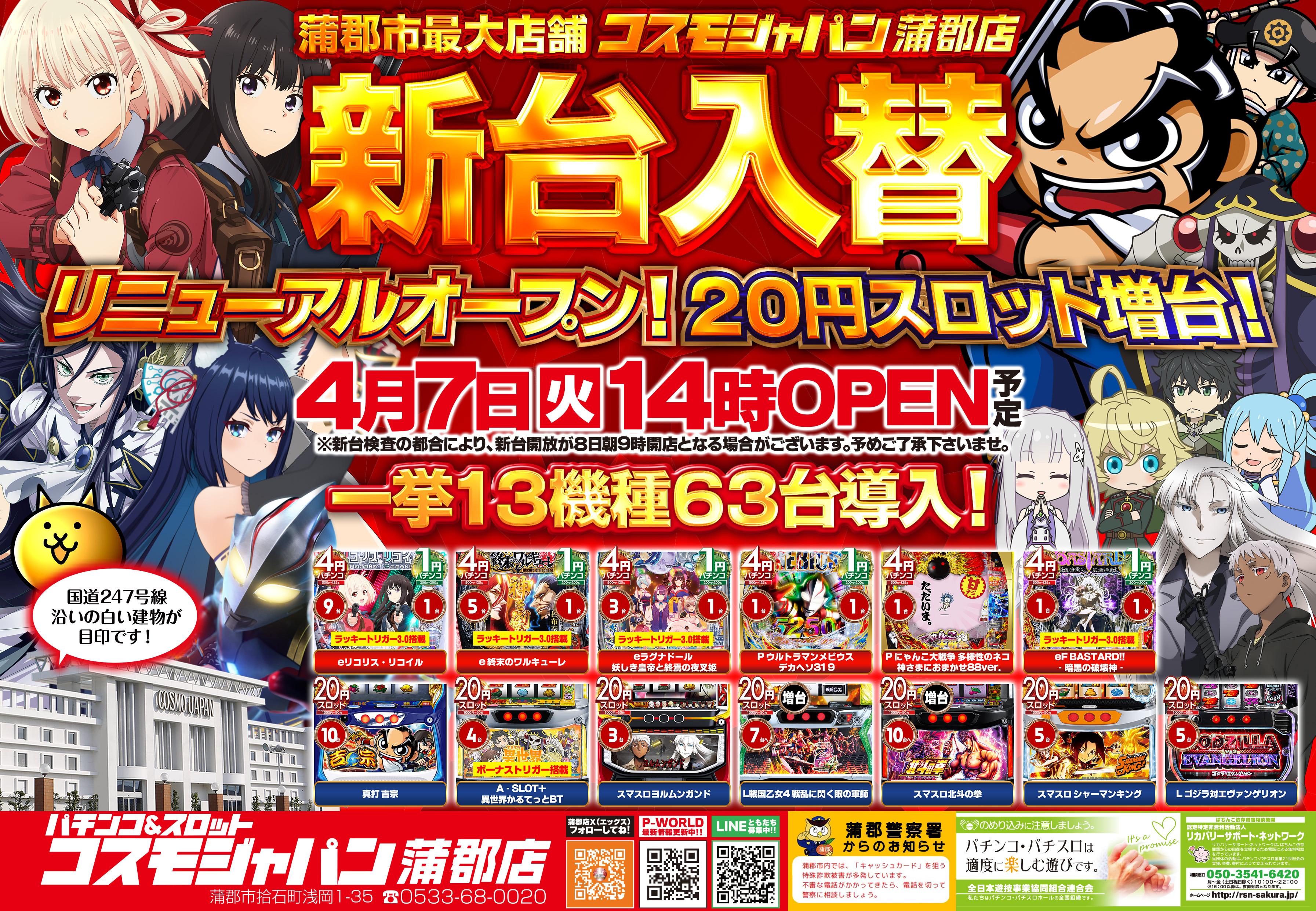 トップ > 店舗検索 > 店舗詳細 蒲郡店 店舗検索店舗一覧へ 蒲郡店 パチンコスロット マッサージチェア 貯玉・再プレイ 無料ロッカー 無料冷蔵ロッカー 大型TV 漫 画 リフレッシュシャワー プレジャービジョン 台情報公開 携帯充電 大型駐車場 ブースターケーブル アメニティグッズ 低貸 アイコン説明 店舗基本情報 オリコミチラシ アクセスマップ 4月7日【火】新台入替 3月16日【月】新台入替 4月7日【火】新台入替 【オモテ面】 新しいウィンドウで開く 3月16日【月】新台入替 【オモテ面】 新しいウィンドウで開く ページの先頭へ