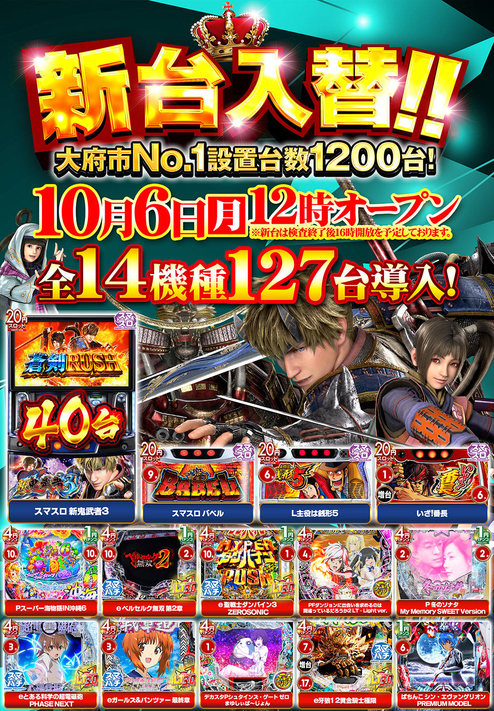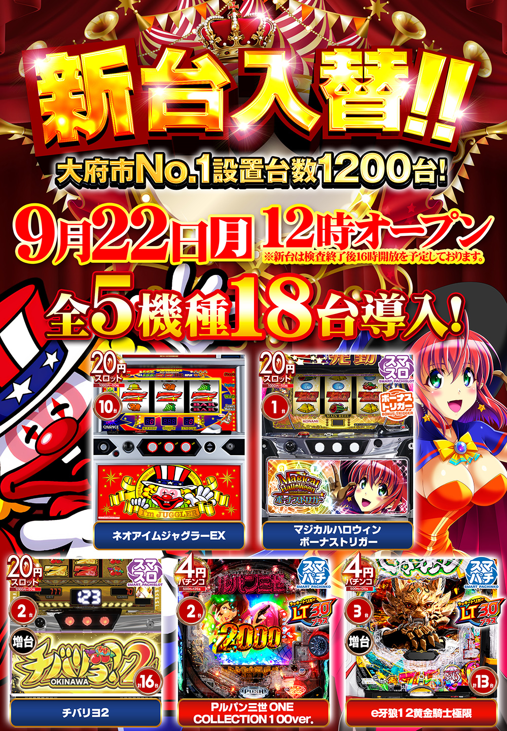 トップ > 店舗検索 > 店舗詳細 大府店 店舗検索店舗一覧へ 大府店 パチンコスロット マッサージチェア 貯玉・再プレイ 無料ロッカー 無料冷蔵ロッカー 大型TV 漫 画 リフレッシュシャワー プレジャービジョン 台情報公開 携帯充電 大型駐車場 ブースターケーブル アメニティグッズ 低貸 アイコン説明 店舗基本情報 オリコミチラシ アクセスマップ 10月6日(月) 旗艦店の新台入替 9月22日(月) 旗艦店の新台入替 10月6日(月) 旗艦店の新台入替 【オモテ面】 新しいウィンドウで開く 9月22日(月) 旗艦店の新台入替 【オモテ面】 新しいウィンドウで開く ページの先頭へ