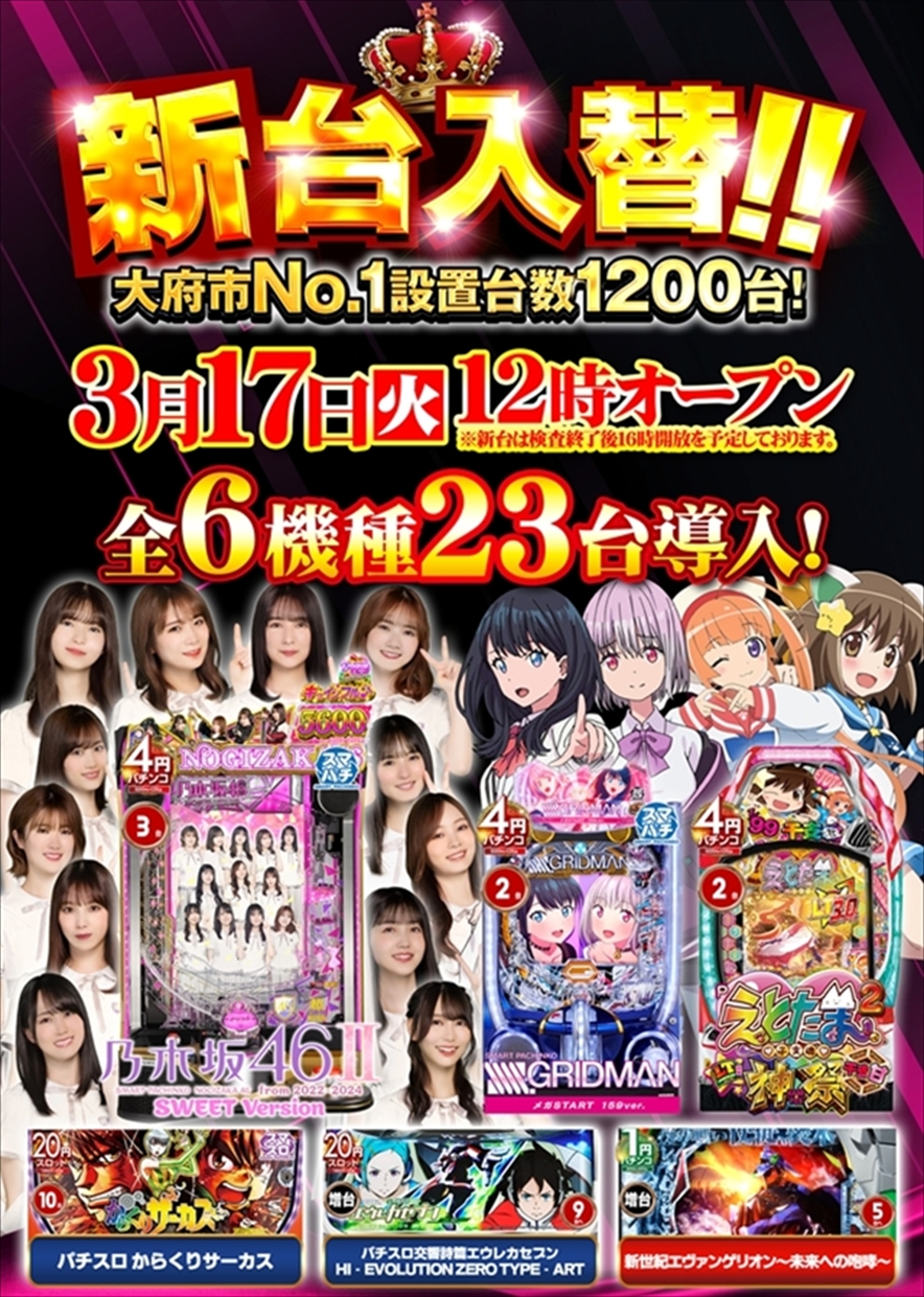 トップ > 店舗検索 > 店舗詳細 大府店 店舗検索店舗一覧へ 大府店 パチンコスロット マッサージチェア 貯玉・再プレイ 無料ロッカー 無料冷蔵ロッカー 大型TV 漫 画 リフレッシュシャワー プレジャービジョン 台情報公開 携帯充電 大型駐車場 ブースターケーブル アメニティグッズ 低貸 アイコン説明 店舗基本情報 オリコミチラシ アクセスマップ 3月17日(火) 新台入替 3月3日(火) 新台入替 3月17日(火) 新台入替 【オモテ面】 新しいウィンドウで開く 3月3日(火) 新台入替 【オモテ面】 新しいウィンドウで開く ページの先頭へ