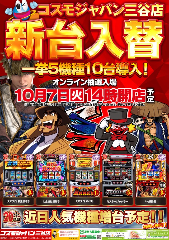 トップ > 新着情報一覧 > 10月7日(火)14時開店=新台入替初日【オンライン抽選入場】 10月7日(火)14時開店=新台入替初日【オンライン抽選入場】 2025年10月1日 三谷店の詳細を見る 一覧へ戻る ページの先頭へ