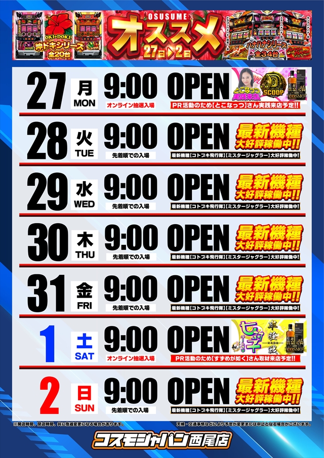 トップ > 新着情報一覧 > 10月27日(月)【とこなっつさん来店×抽選入場】朝9時OPEN♪ 10月27日(月)【とこなっつさん来店×抽選入場】朝9時OPEN♪ 2025年10月27日 西尾店の詳細を見る 一覧へ戻る ◆◆◆SLOT専門店◆◆◆ COSMOJAPAN 西尾店 ★本日10月27日(月)★ ★朝9時OPEN★ 【今週のオススメ】 【今月のおすすめ】 ☆★☆★☆★☆★☆★☆★☆★☆★☆★☆★☆★☆★☆★☆ ☆★☆★☆★☆★☆★☆★☆★☆★☆★☆★☆★☆★☆★☆ ☆★☆★☆★☆★☆★☆★☆★☆★☆★☆★☆★☆★☆★☆ ☆★☆★☆★☆★☆★☆★☆★☆★☆★☆★☆★☆★☆★☆ ページの先頭へ