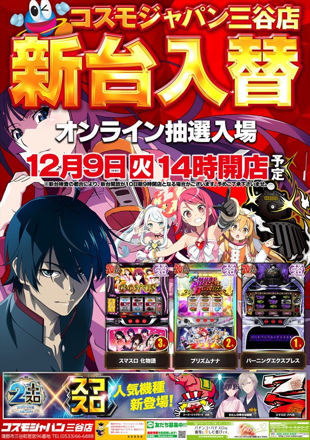 トップ > 新着情報一覧 > 12月9日(火)14時開店【新台入替初日】=オンライン抽選入場 12月9日(火)14時開店【新台入替初日】=オンライン抽選入場 2025年12月2日 三谷店の詳細を見る 一覧へ戻る ページの先頭へ