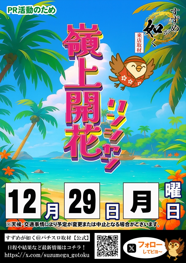 トップ > 新着情報一覧 > 12月27日(土)◆伝説の刻◆取材来店!朝9時OPEN! 12月27日(土)◆伝説の刻◆取材来店!朝9時OPEN! 2025年12月26日 大府店の詳細を見る 一覧へ戻る 12月27日(土) 朝9時OPEN!! ご来店お待ちしてます! ページの先頭へ