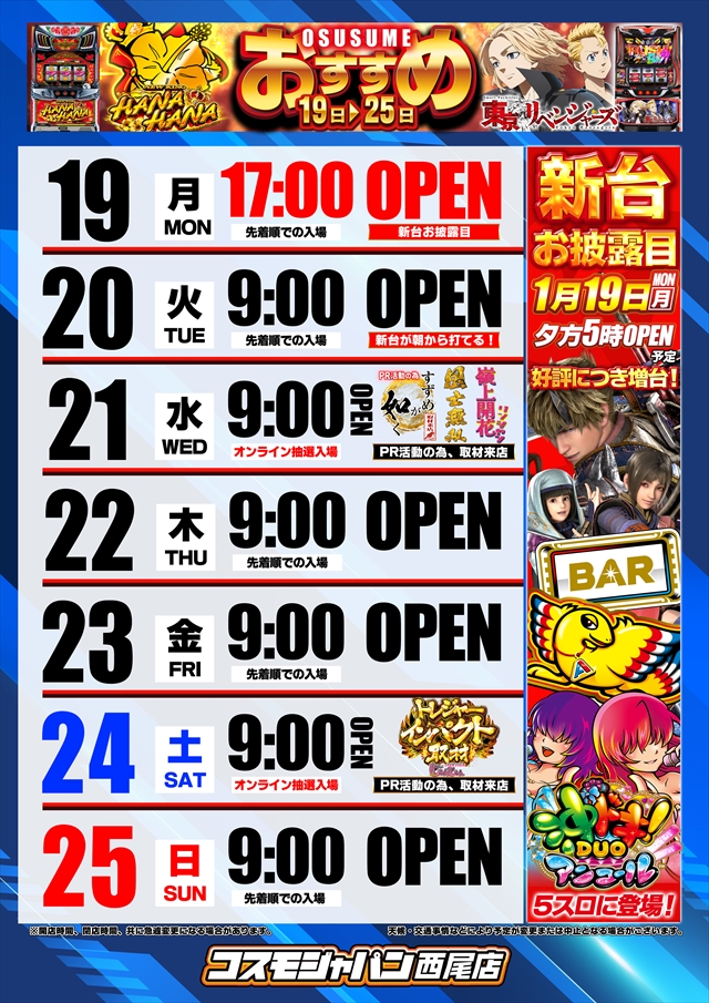 トップ > 新着情報一覧 > 1月19日(月) 【新台お披露目】夕方5時OPEN♪ 1月19日(月) 【新台お披露目】夕方5時OPEN♪ 2026年1月19日 西尾店の詳細を見る 一覧へ戻る ◆◆◆SLOT専門店◆◆◆ COSMOJAPAN 西尾店 ★本日1月19日(月)★ 【新台お披露目】 ★夕方5時OPEN★ ☆★☆★☆★☆★☆★☆★☆★☆★☆★☆★☆★☆★☆★☆ 【今週のおすすめ】 ☆★☆★☆★☆★☆★☆★☆★☆★☆★☆★☆★☆★☆★☆ ☆★☆★☆★☆★☆★☆★☆★☆★☆★☆★☆★☆★☆★☆ ☆★☆★☆★☆★☆★☆★☆★☆★☆★☆★☆★☆★☆★☆ ☆★☆★☆★☆★☆★☆★☆★☆★☆★☆★☆★☆★☆★☆ ページの先頭へ