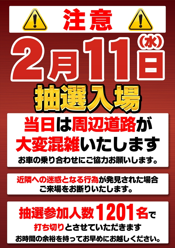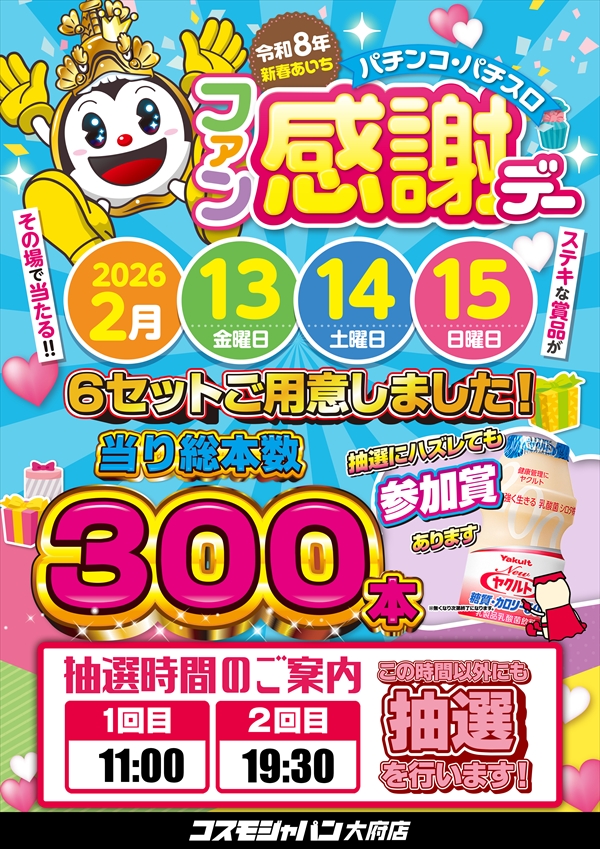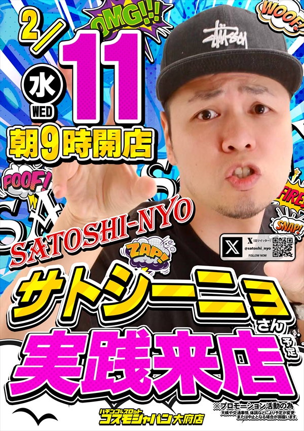 トップ > 新着情報一覧 > 2月7日(土) 【しゅんすけ】さん来店!賞品入荷!朝9時OPEN!! 2月7日(土) 【しゅんすけ】さん来店!賞品入荷!朝9時OPEN!! 2026年2月6日 大府店の詳細を見る 一覧へ戻る 2月7日(土) 朝9時OPEN!! ご来店お待ちしてます! ◆抽選のご案内◆ ページの先頭へ