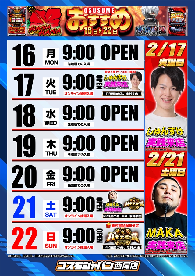 2月15日(日) すずめが如くW取材来店!【ファン感謝デー最終日】朝9時OPEN♪