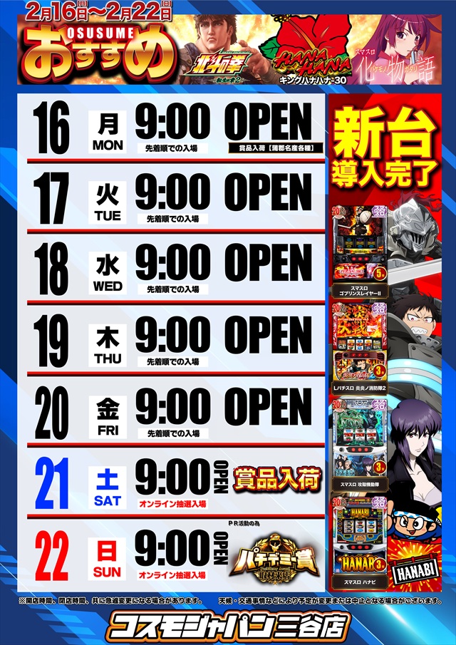 トップ > 新着情報一覧 > 2月15日(日)朝9時開店=オンライン抽選入場 2月15日(日)朝9時開店=オンライン抽選入場 2026年2月14日 三谷店の詳細を見る 一覧へ戻る 2月15日(日) 朝9時開店 オンライン抽選入場 ★☆★☆★☆★☆★☆★☆★☆★ DMMぱちタウンアプリで 無料で台データを掲載 ★☆★☆★☆★☆★☆★☆★☆★ ★☆★☆★☆★☆★☆★☆★☆★ S N S ★☆★☆★☆★☆★☆★☆★☆★ L I N E友だち募集中!! 最新情報を配信致します!! ↓ ↓ ↓ ↓ ★☆★☆★☆★☆★☆★☆★☆★ ご案内 ★☆★☆★☆★☆★☆★☆★☆★ 接続先 COSMOJAPAN_MIYA パスワード cosmo33333333 お気軽にお問合せ下さい♪ ページの先頭へ