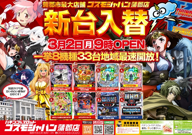トップ > 新着情報一覧 > 3月2日(月) ◆◆ 新台入替◆◆一挙8機種33台地域最速開放!!! 3月2日(月) ◆◆ 新台入替◆◆一挙8機種33台地域最速開放!!! 2026年2月25日 蒲郡店の詳細を見る 一覧へ戻る ページの先頭へ