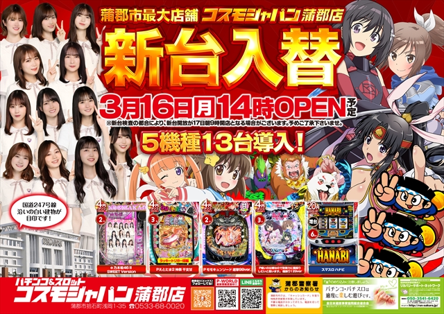 トップ > 新着情報一覧 > 3月16日(月) ◆◆ 新台入替◆◆5機種18台導入 3月16日(月) ◆◆ 新台入替◆◆5機種18台導入 2026年3月8日 蒲郡店の詳細を見る 一覧へ戻る ページの先頭へ
