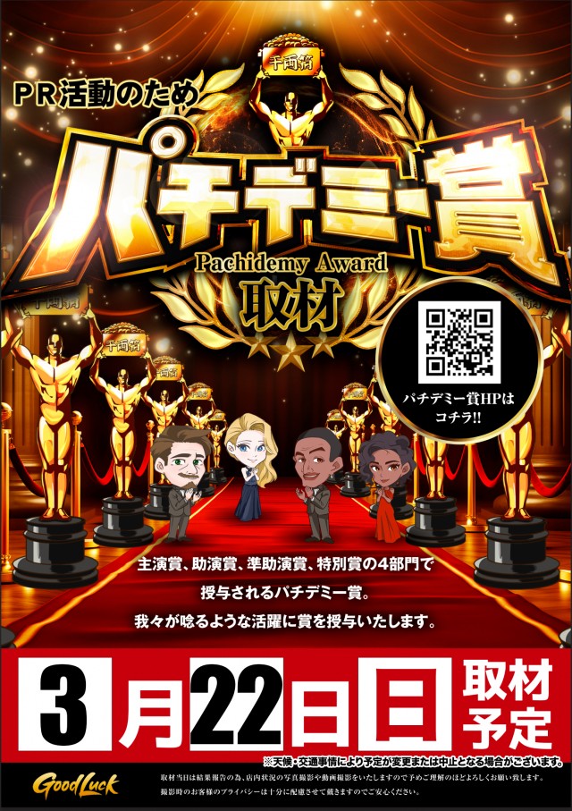 トップ > 新着情報一覧 > 3月22日(日) 【愛知×三重】合同賞品入荷!【パチデミー賞】取材来店!朝9時OPEN!! 3月22日(日) 【愛知×三重】合同賞品入荷!【パチデミー賞】取材来店!朝9時OPEN!! 2026年3月21日 大府店の詳細を見る 一覧へ戻る 3月22日(日) 朝9時OPEN!! ご来店お待ちしてます! ◆抽選のご案内◆ ページの先頭へ