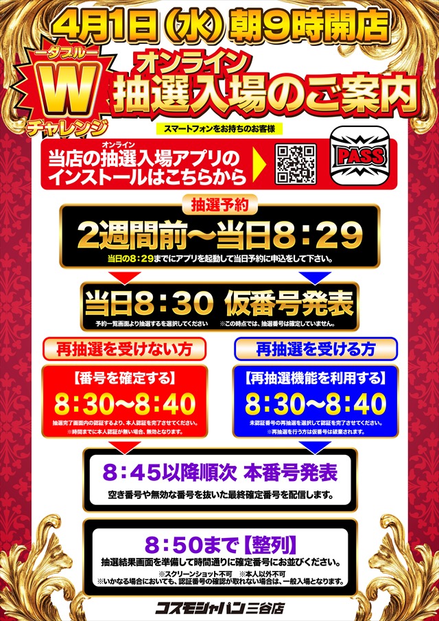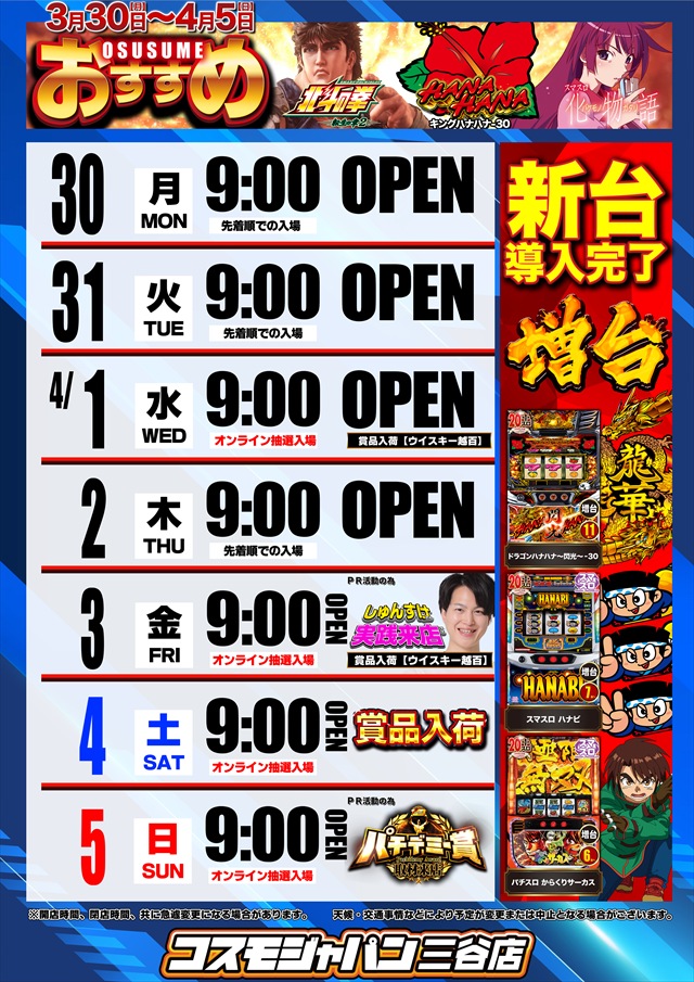 トップ > 新着情報一覧 > 3月28日(土) 朝9時開店=オンライン抽選入場 3月28日(土) 朝9時開店=オンライン抽選入場 2026年3月27日 三谷店の詳細を見る 一覧へ戻る 3月28日(土) 朝9時開店 オンライン抽選入場 ★☆★☆★☆★☆★☆★☆★☆★ DMMぱちタウンアプリで 無料で台データを掲載 ★☆★☆★☆★☆★☆★☆★☆★ ★☆★☆★☆★☆★☆★☆★☆★ S N S ★☆★☆★☆★☆★☆★☆★☆★ L I N E友だち募集中!! 最新情報を配信致します!! ↓ ↓ ↓ ↓ ★☆★☆★☆★☆★☆★☆★☆★ ご案内 ★☆★☆★☆★☆★☆★☆★☆★ 接続先 COSMOJAPAN_MIYA パスワード cosmo33333333 お気軽にお問合せ下さい♪ ページの先頭へ