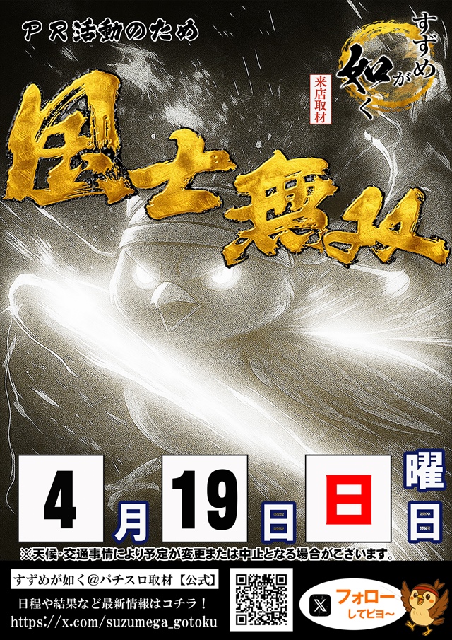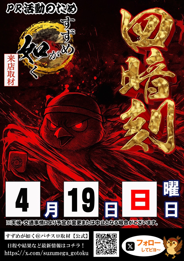 4月11日(土) 【すずめが如く】W取材来店!朝9時OPEN♪