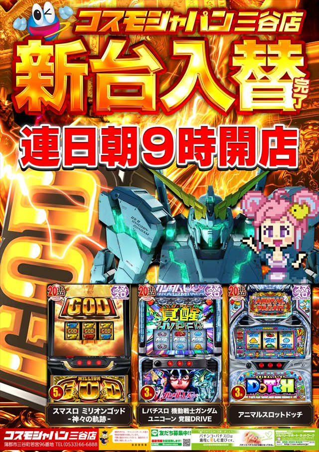 トップ > 新着情報一覧 > 4月21日(火)朝9時開店=オンライン抽選入場 4月21日(火)朝9時開店=オンライン抽選入場 2026年4月20日 三谷店の詳細を見る 一覧へ戻る 4月21日(火) 朝9時開店 オンライン抽選入場 ★☆★☆★☆★☆★☆★☆★☆★ DMMぱちタウンアプリで 無料で台データを掲載 ★☆★☆★☆★☆★☆★☆★☆★ ★☆★☆★☆★☆★☆★☆★☆★ S N S ★☆★☆★☆★☆★☆★☆★☆★ L I N E友だち募集中!! 最新情報を配信致します!! ↓ ↓ ↓ ↓ ★☆★☆★☆★☆★☆★☆★☆★ ご案内 ★☆★☆★☆★☆★☆★☆★☆★ 接続先 COSMOJAPAN_MIYA パスワード cosmo33333333 お気軽にお問合せ下さい♪ ページの先頭へ